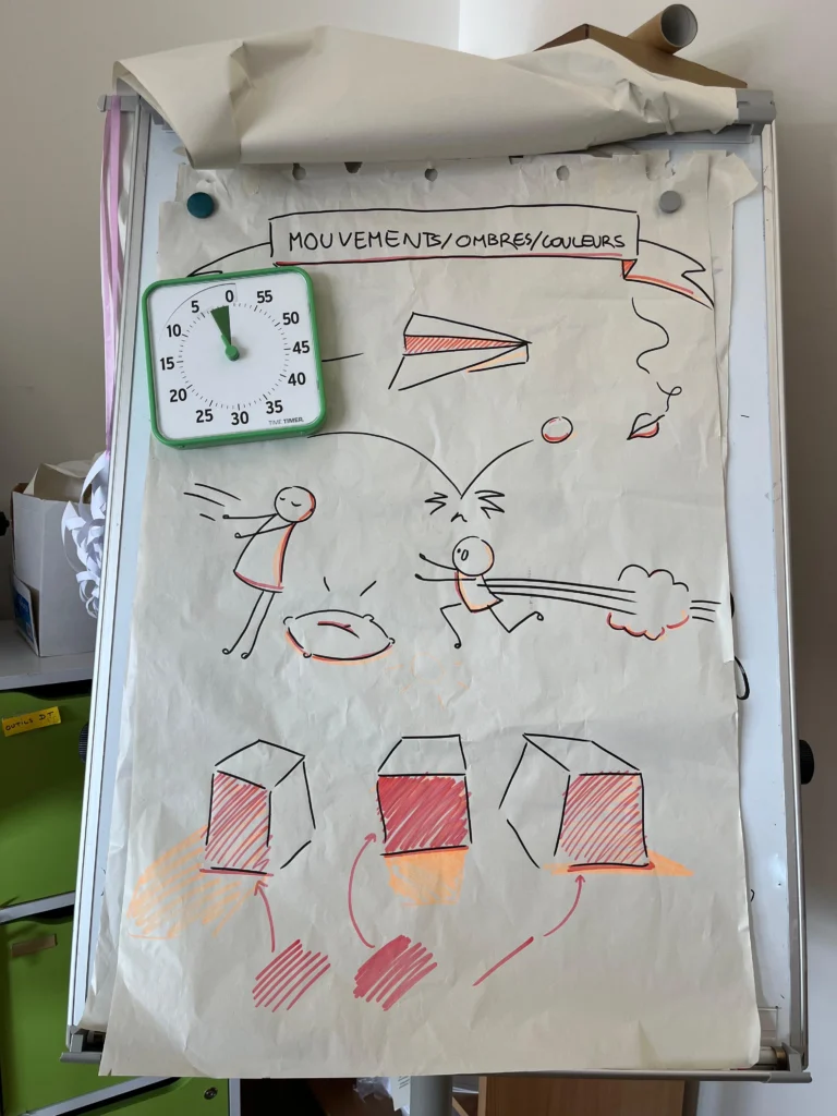 Cet outil peut être utilisé en collaboration : tout le monde peut parler, contribuer, co-construire l’organisation de la feuille et de l’information. On peut décider ensemble de ce qui est important ou non. Le débat peut ensuite naître à partir du dessin.