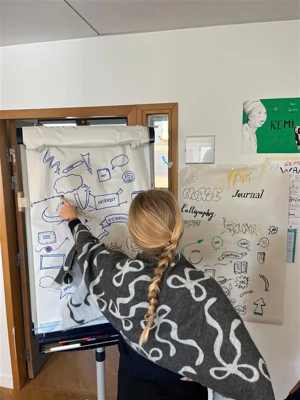 Ils ont pu appliquer différents exercices et comprendre les principaux avantages de la facilitation graphique, ainsi que la manière de les utiliser concrètement dans leurs projets. Ce temps d’apprentissage leur a permis de découvrir une nouvelle manière de structurer leurs idées, de collaborer et de communiquer visuellement dans le cadre de leur travail d’équipe.